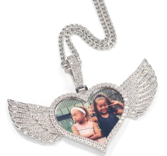 Personalized Diamond Studded Angel Wings Photo Necklace | Custom Photo Necklace | Engraving